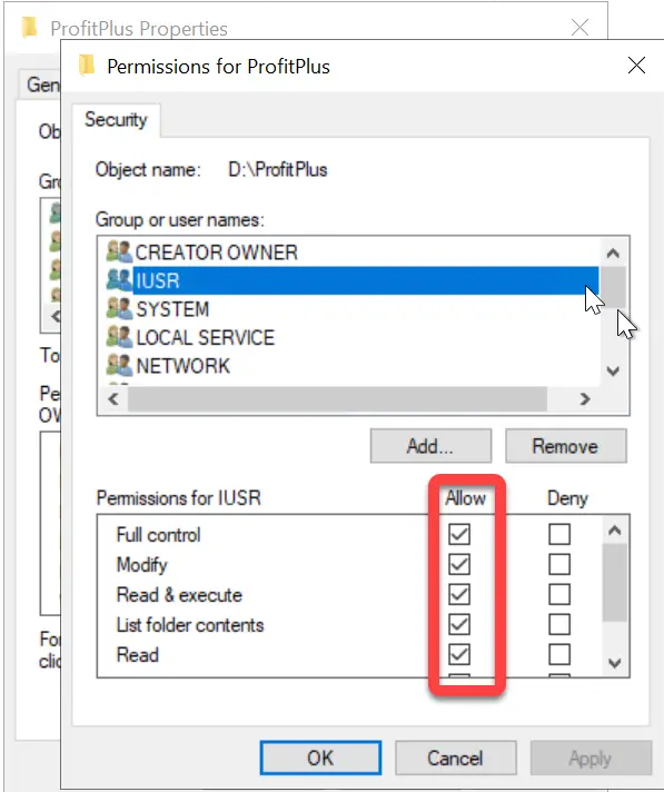 Debemos ir a la carpeta donde se encuentra en sitio web del servidor de Profit Plus y dentro de la permisología de seguridad, darles acceso total a los siguientes objetos: IUSR, Local Service, Network, Network Configuration, Network Service.