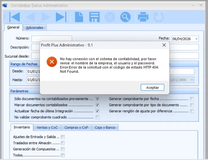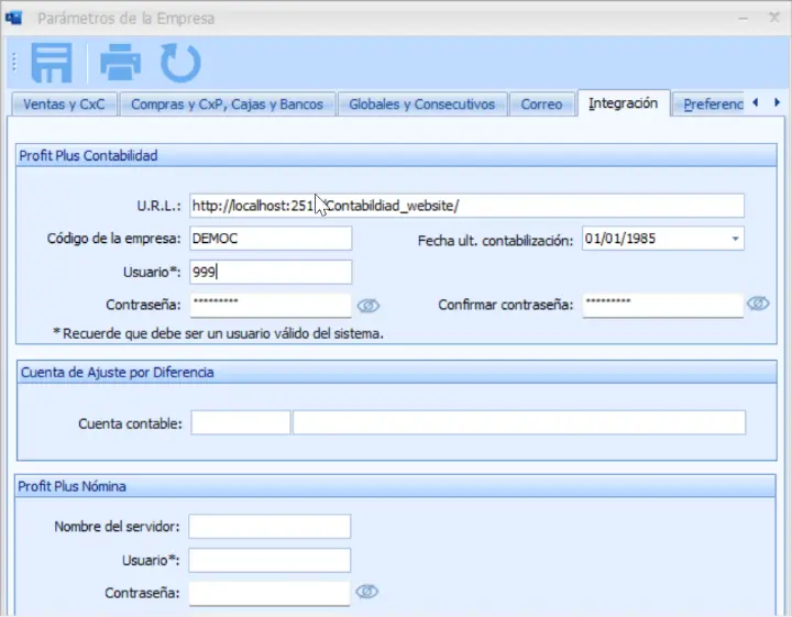 En usuario debe colocar un usuario de Profit que tenga mapa 100 y privilegios totales.