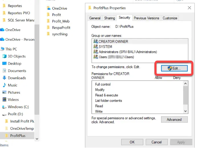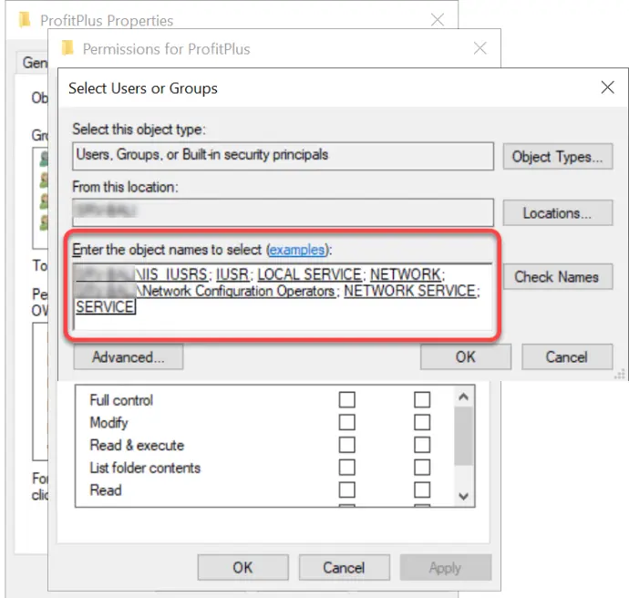 Debemos ir a la carpeta donde se encuentra en sitio web del servidor de Profit Plus y dentro de la permisología de seguridad, darles acceso total a los siguientes objetos: IUSR, Local Service, Network, Network Configuration, Network Service.